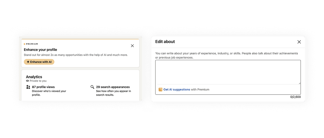 LinkedIn shows the user a banner with AI feature recommendations. Additionally, it displays AI-related buttons across relevant sections.