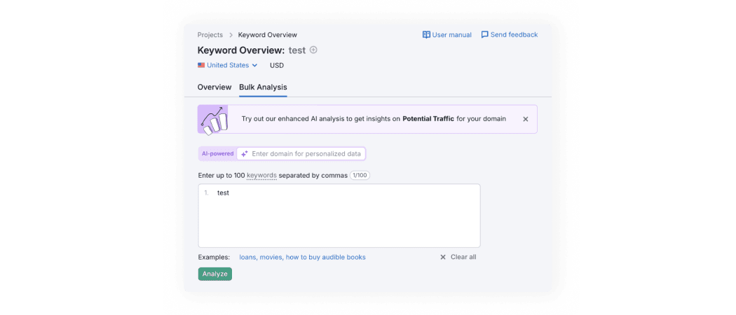 Semrush shows the user a banner with AI feature recommendations. Additionally, it displays “AI-powered” label near relevant field.