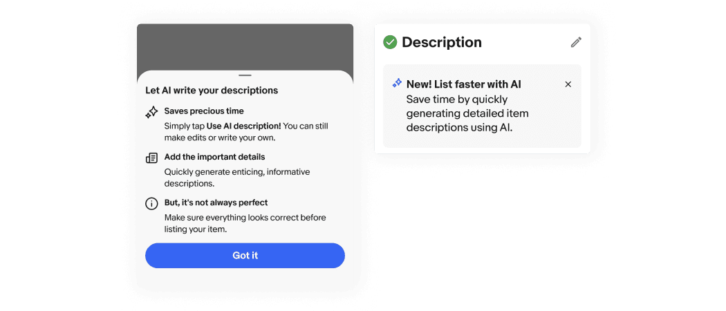 eBay shows the user a modal window with all AI features details. Additionally, it displays banners with AI-related details across relevant sections.