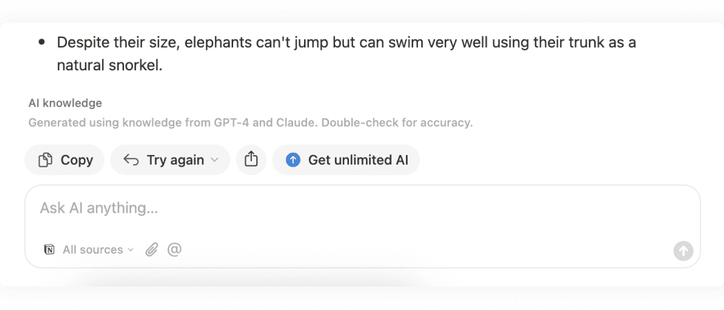 Notion AI disclaimer placed under the message and near the actions, so banner blindness won't affect it, and the user will definitely notice it while copying.