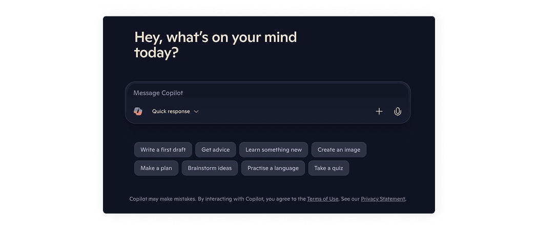 Microsoft Copilot disclaimer is placed in the most common location – under the chat text area.