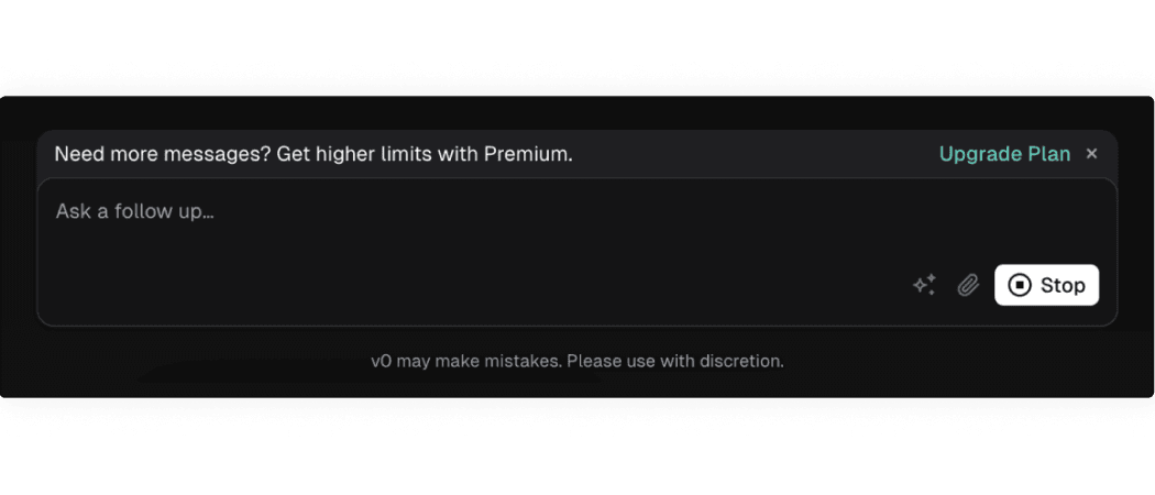 v0 disclaimer is placed in the most common location – under the chat text area.