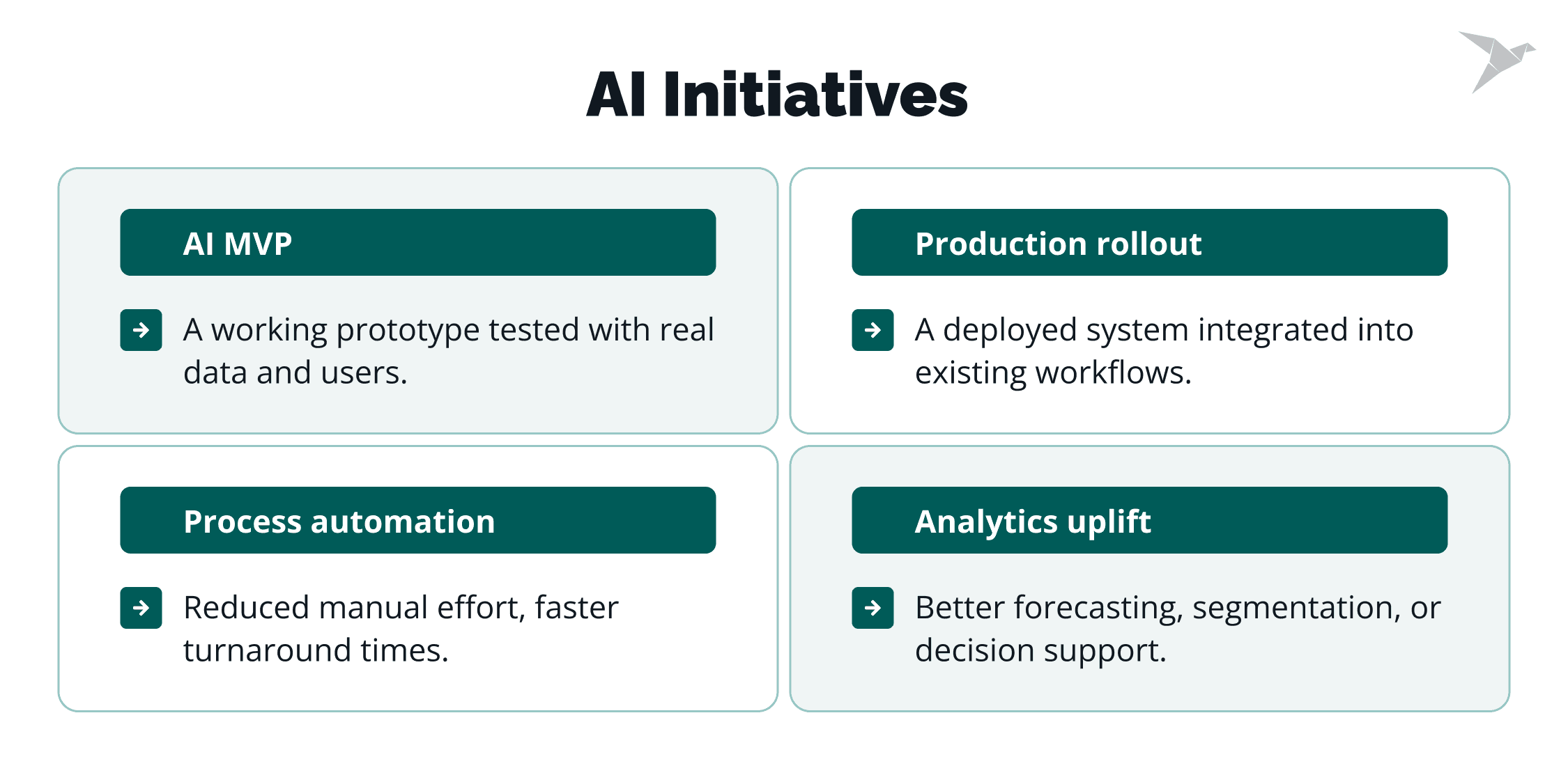 You should aim for a clear outcome you can measure, not a vague “AI initiative.” Before choosing AI development partner, decide what you’re building: an AI MVP to validate an idea, a production rollout, process automation, or an analytics uplift. Then translate that goal into concrete deliverables, so the scope stays tied to results.