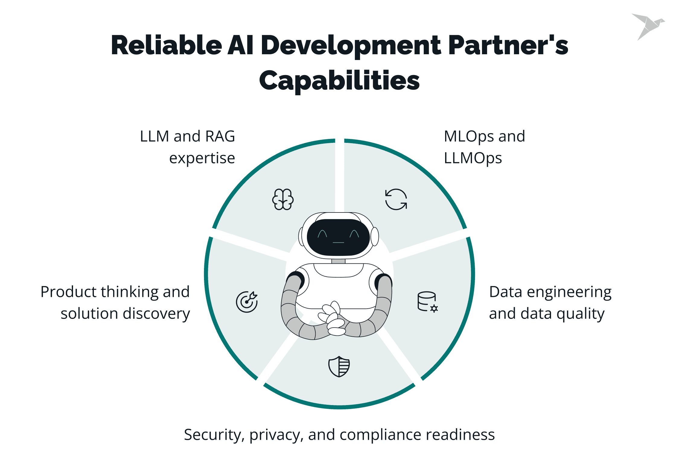 The right partner must cover the full delivery chain – the whole process from idea to stable operation. So, when thinking about how to choose an AI development partner, look beyond model demos. You need capabilities that map to real work: shaping the problem, preparing the data, building the system, deploying it, and keeping it reliable over time.