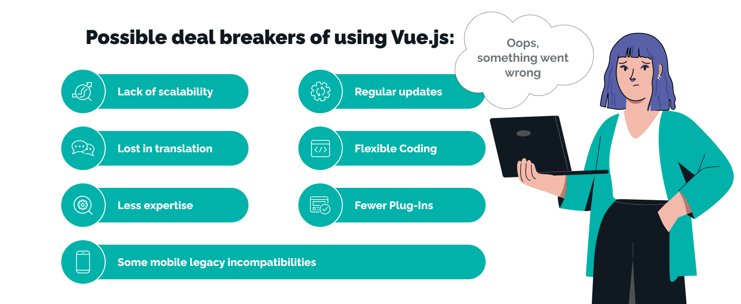 With all these advantages, why isn’t the whole world using Vue? As with anything, there are a few cons to weigh against the Vue pros, and we would be remiss not to point them out.