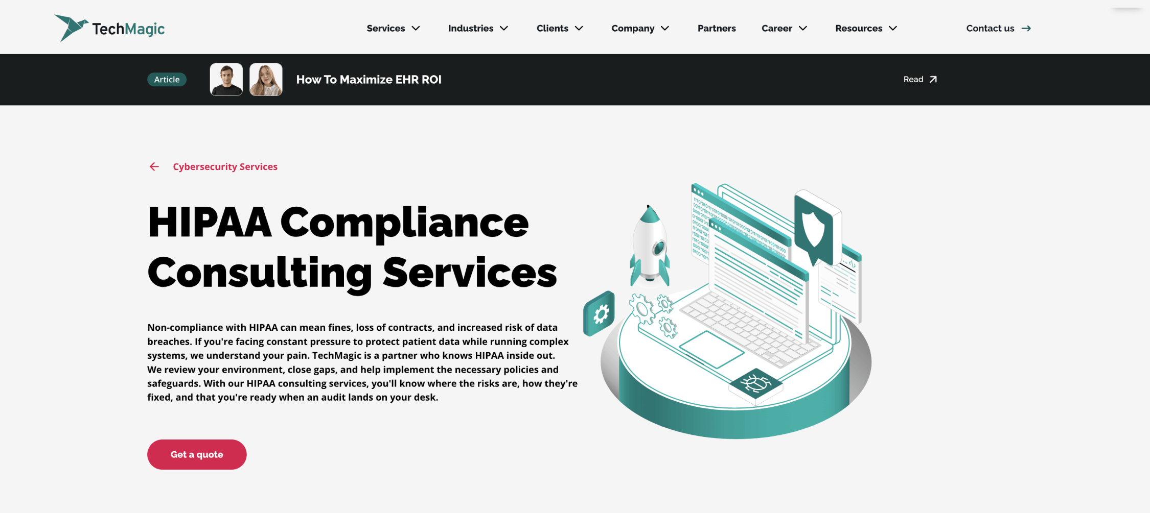 TechMagic provides HIPAA consulting services focused on practical, execution-driven compliance for digital health and healthcare technology companies. Their work covers HIPAA Security Rule and HIPAA Privacy Rule readiness, security risk analysis, remediation planning, and audit support.