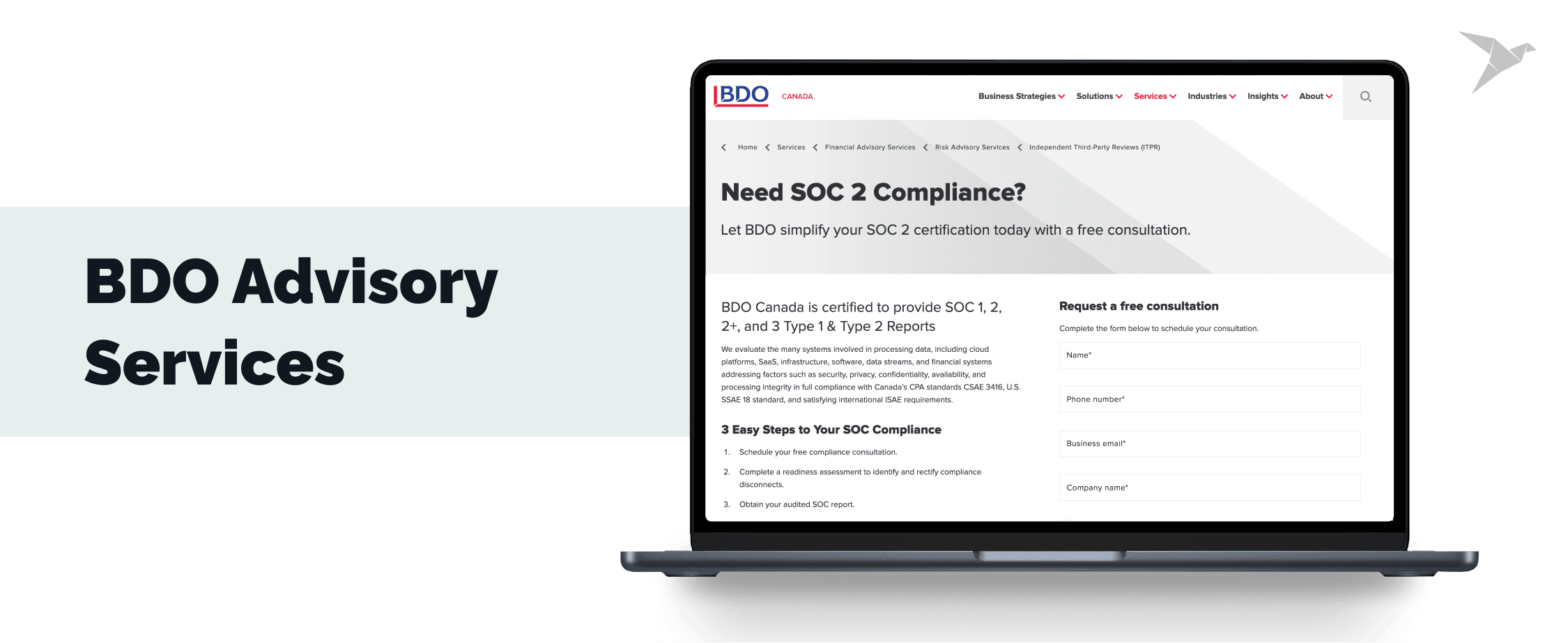 BDO’s advisory arm is typically selected by mid-market and enterprise organizations where SOC 2 is part of a broader risk and governance landscape. Their strength lies in governance, internal controls, and executive-level reporting. They are effective when SOC 2 must align with board oversight, enterprise risk management, or multiple compliance frameworks.