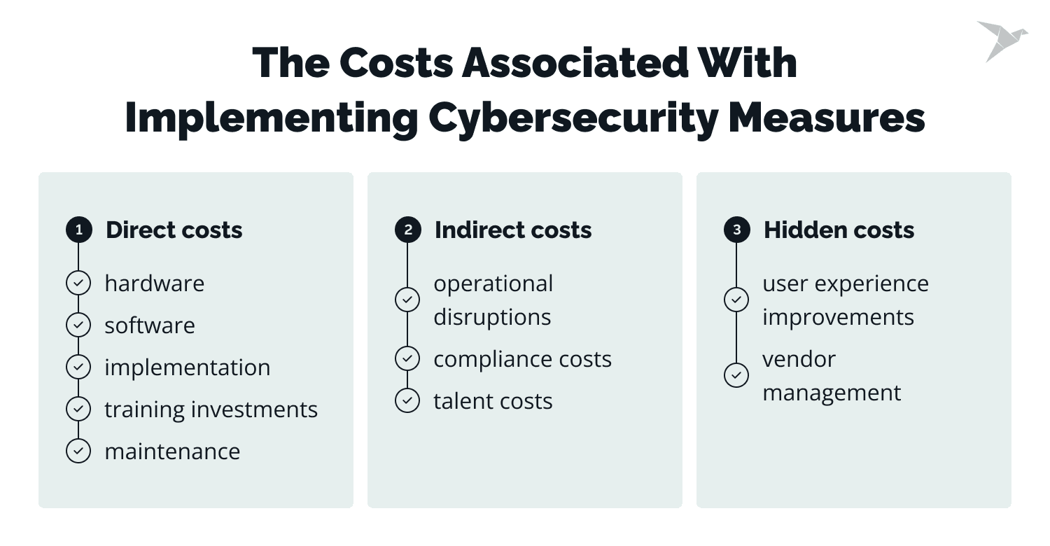 You should also consider such a category as hidden costs. They are related to the impact on user interaction and supplier management. In the first case, additional security tools such as multi-factor authentication (MFA) or strict access control can change the digital experience of your users and require more money to improve it. In the second case, you should consider the costs associated with managing third-party vendors and ensuring they meet cybersecurity standards.