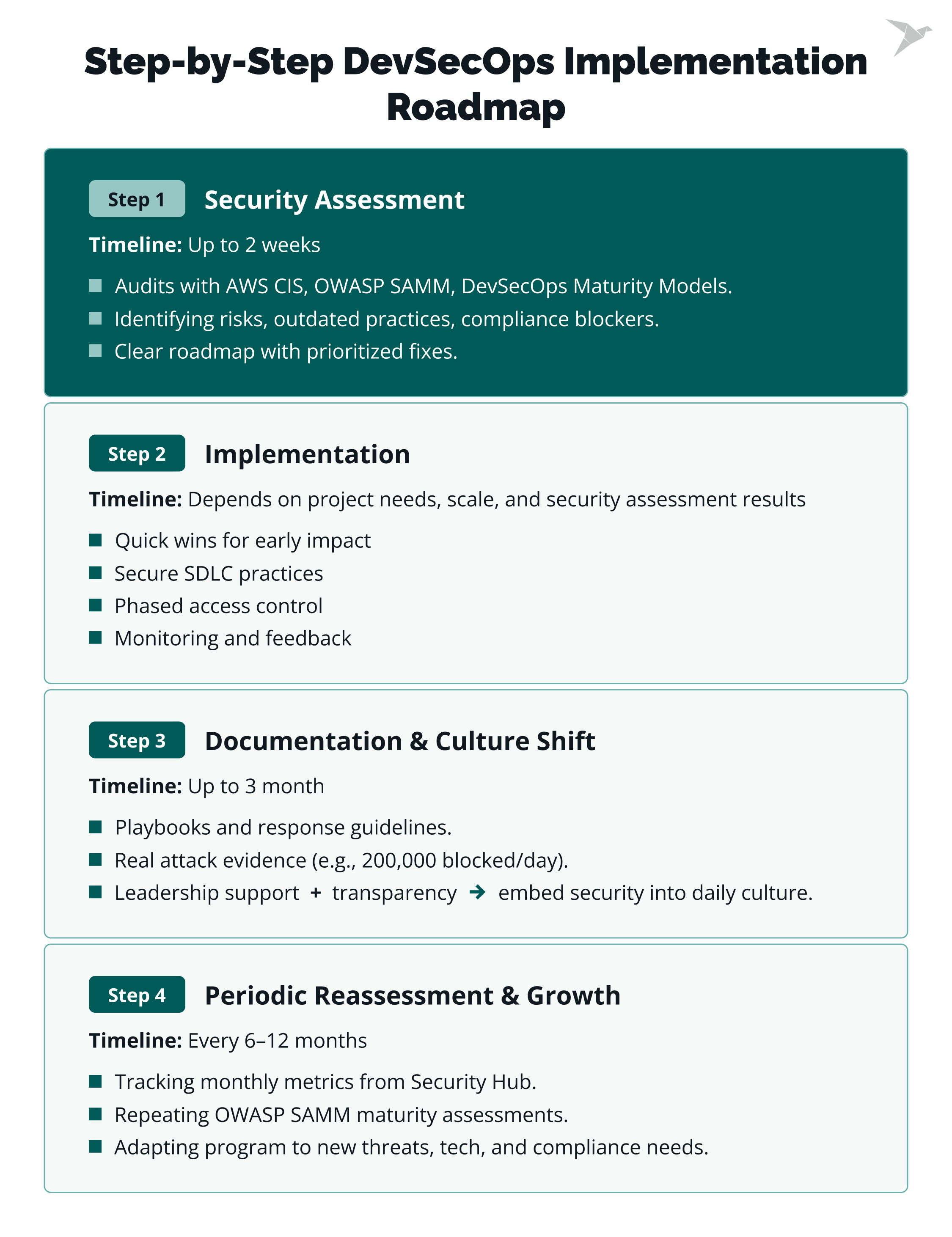 We always start our DevSecOps implementation roadmap with a baseline. Together with CTOs, product owners, and tech leads, we run a full audit using frameworks like AWS CIS Benchmarks, OWASP SAMM, or DevSecOps Maturity Models.