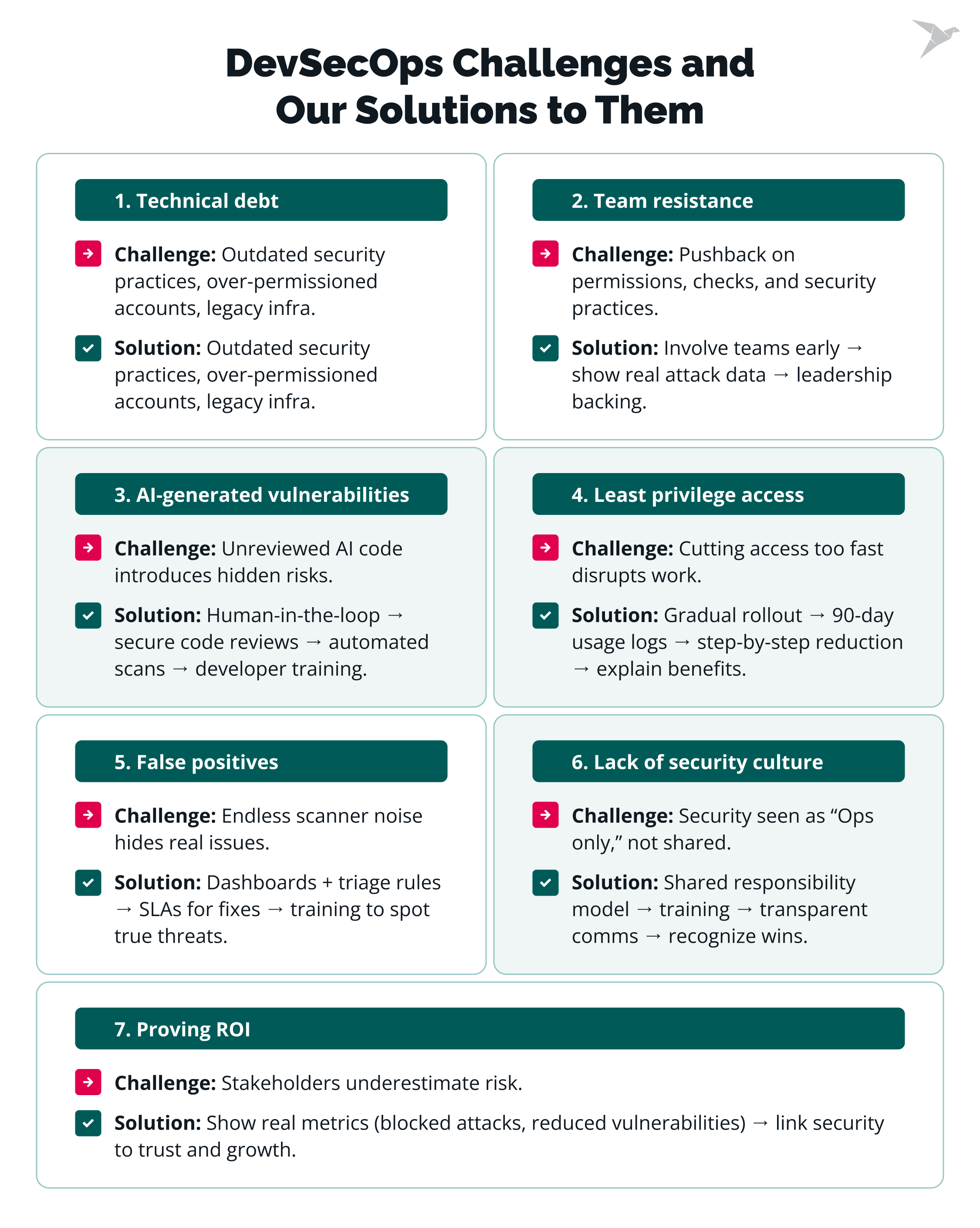 - Typical challenges of DevSecOps implementation are technical debt and disruption, AI-generated code risks, team resistance, scanner noise, and security culture gaps.