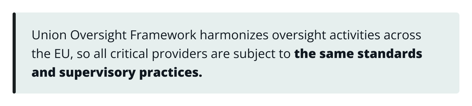 Union Oversight Framework harmonizes oversight activities across the EU, so all critical providers are subject to the same standards and supervisory practices. It highly reduces regulatory inconsistencies.
