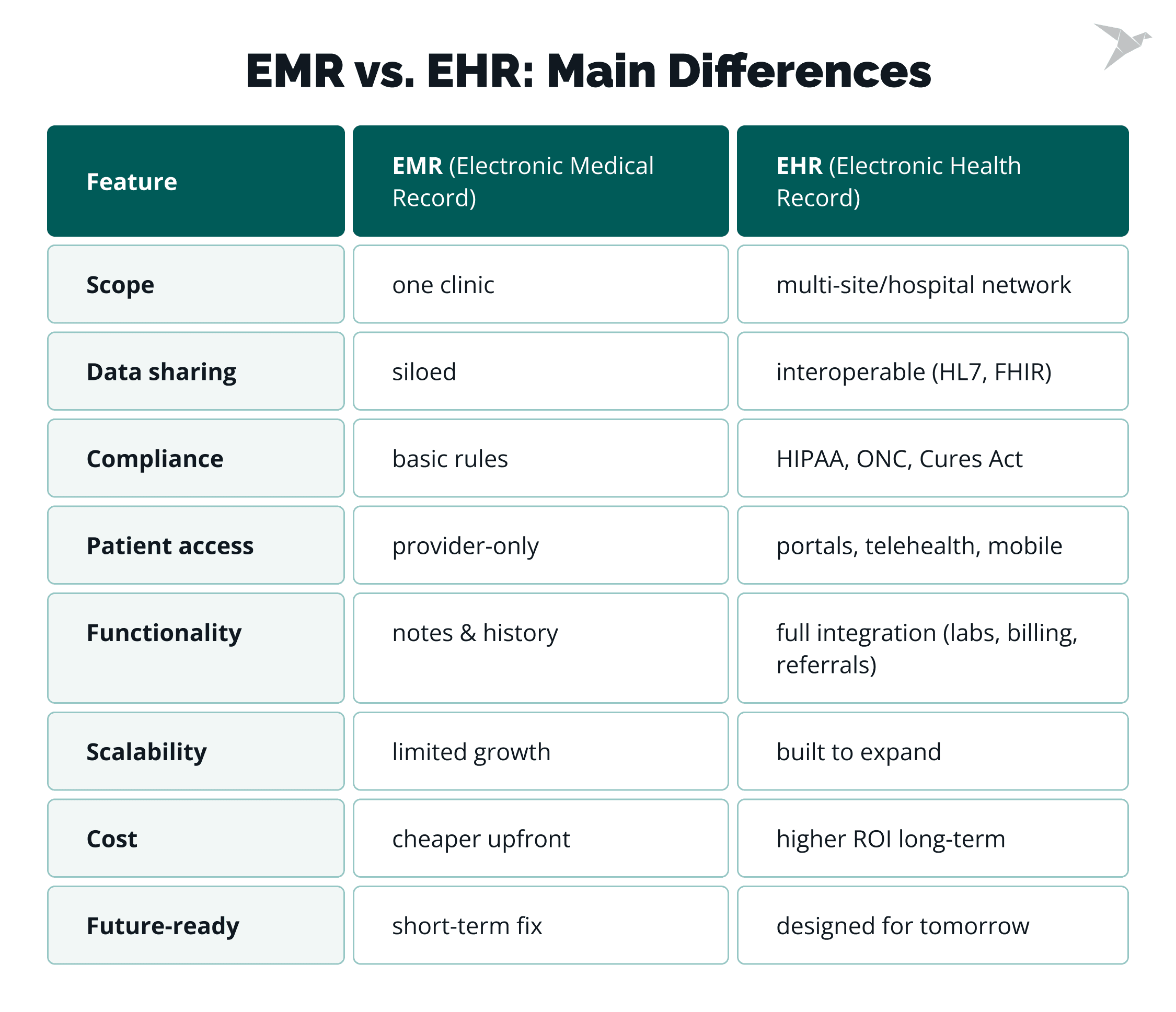 - Cost looks different short- vs. long-term. EMRs are cheaper to start, while EHRs bring higher ROI through efficiency and growth.