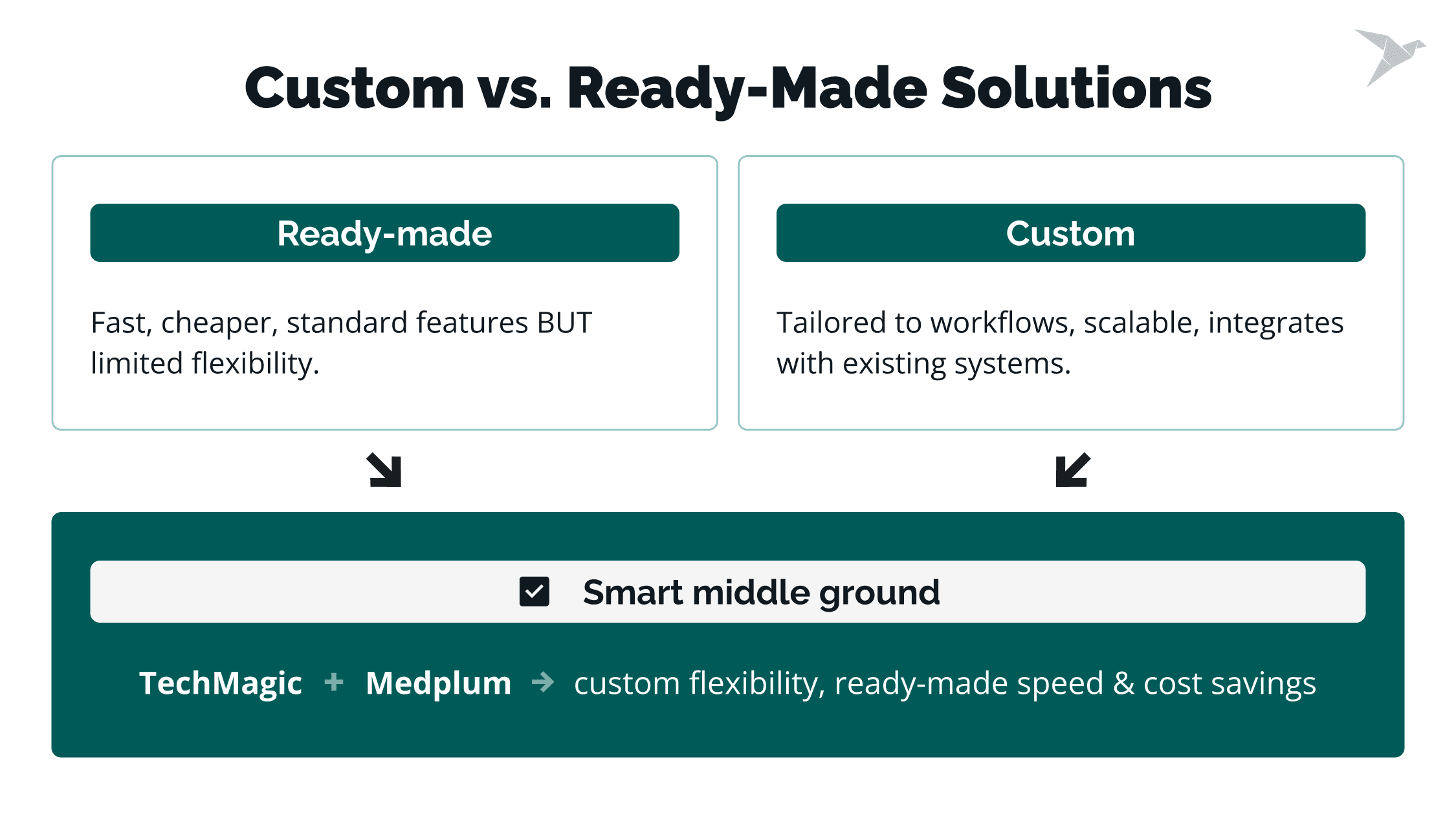 - TechMagic supports both paths. We can help you integrate ready-made tools or build cost-effective custom platforms with partners like Medplum.