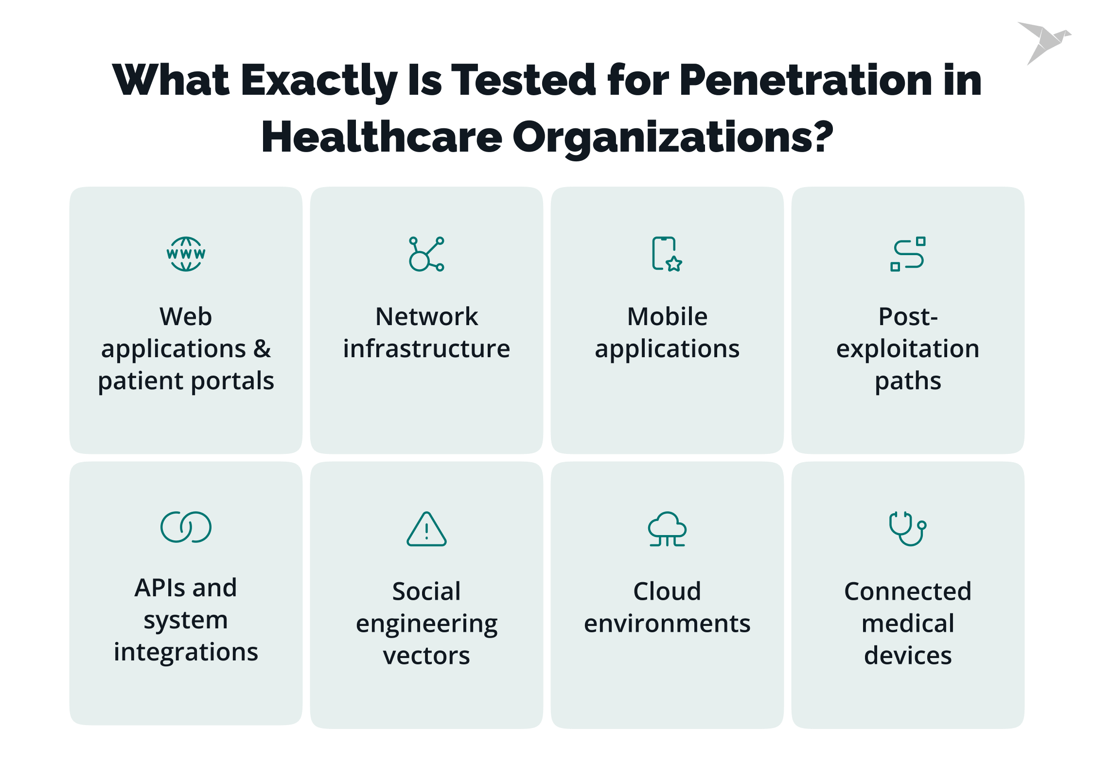 Pen testing focuses on the systems and workflows that keep care running and protect patient data. The primary goal here is to show where real-world attackers could get in, how they might move through the environment, and what information they could reach.