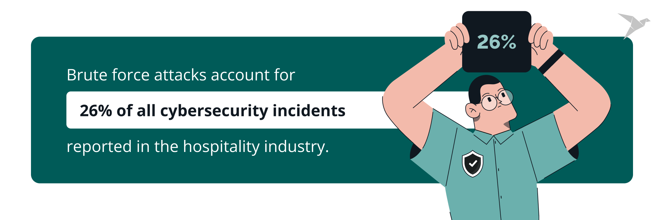 Brute force attacks account for 26% of all cybersecurity incidents reported in the hospitality industry. These attacks involve the use of automated tools that systematically guess passwords until the correct one is found.