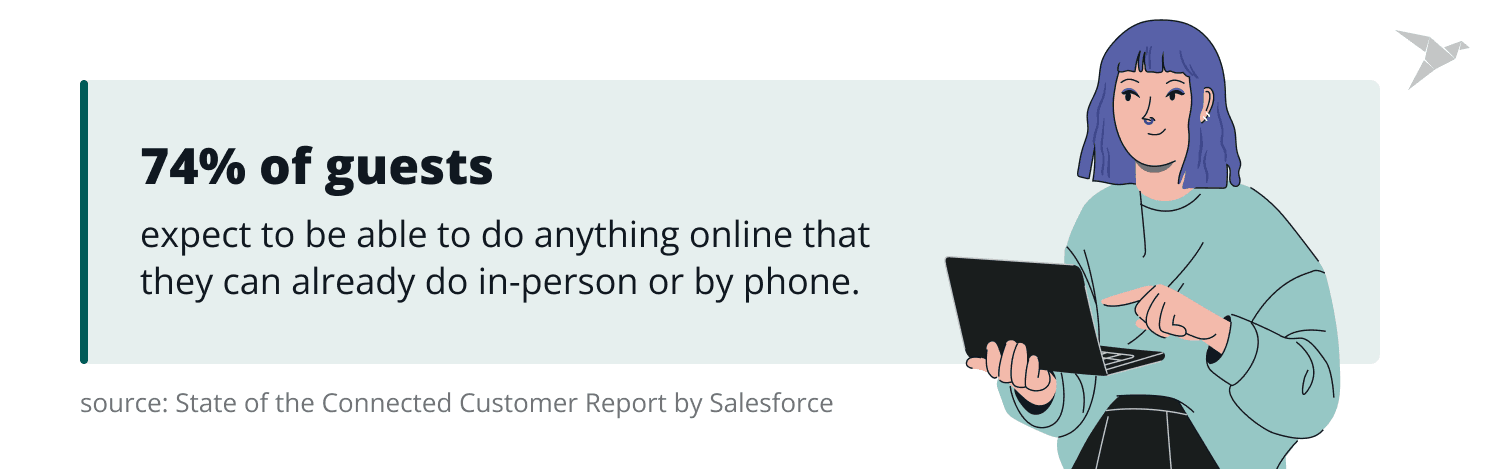A business traveler arriving late at night may appreciate the ability to check in through an app and head straight to their room without any delay. A report by Salesforce found that 74% of guests want to have the possibility of completing tasks that they can do face-to-face – online.