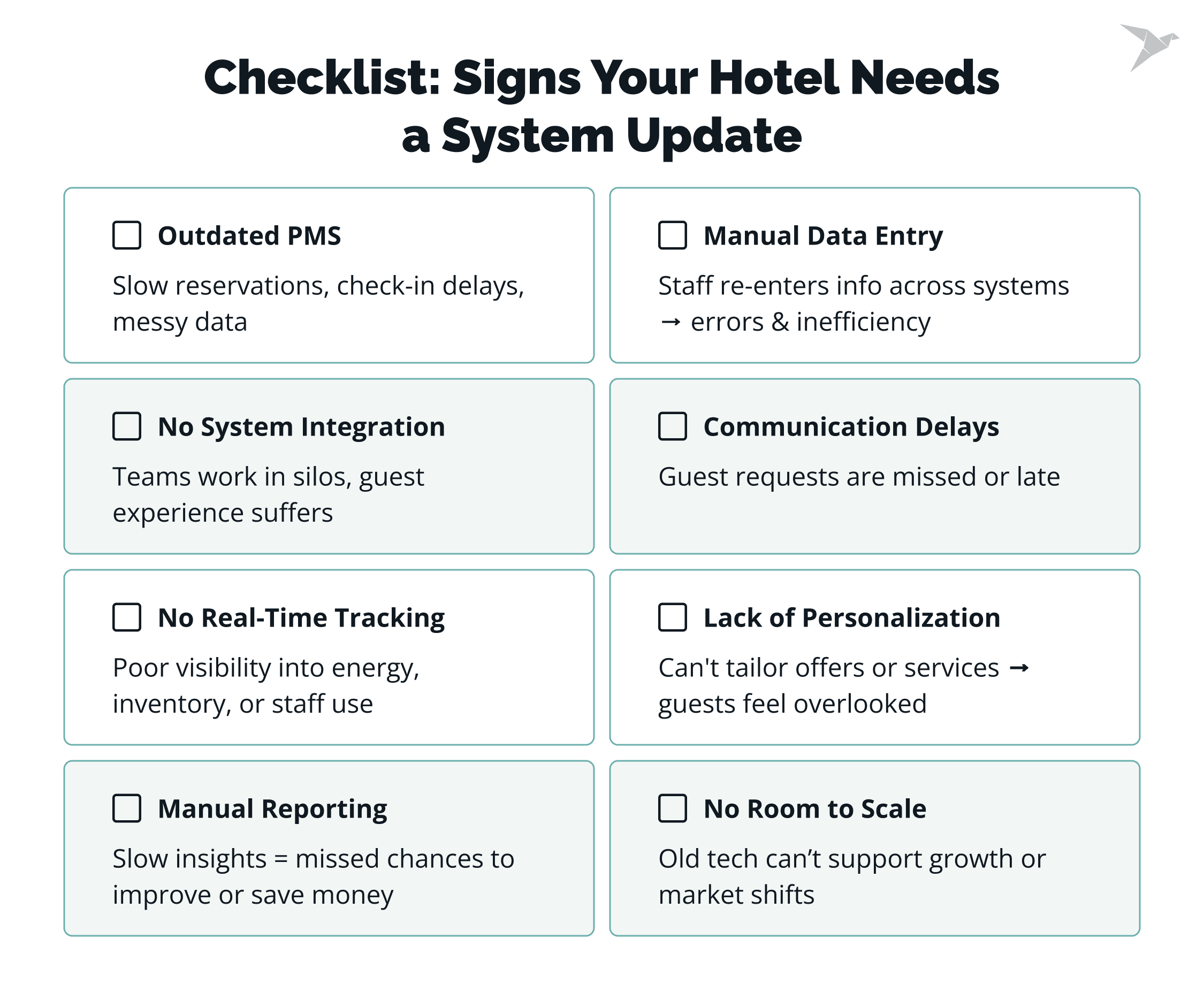 - Outdated hotel systems cause delays, errors, and frustration for both staff and guests. They hurt service quality and revenue.