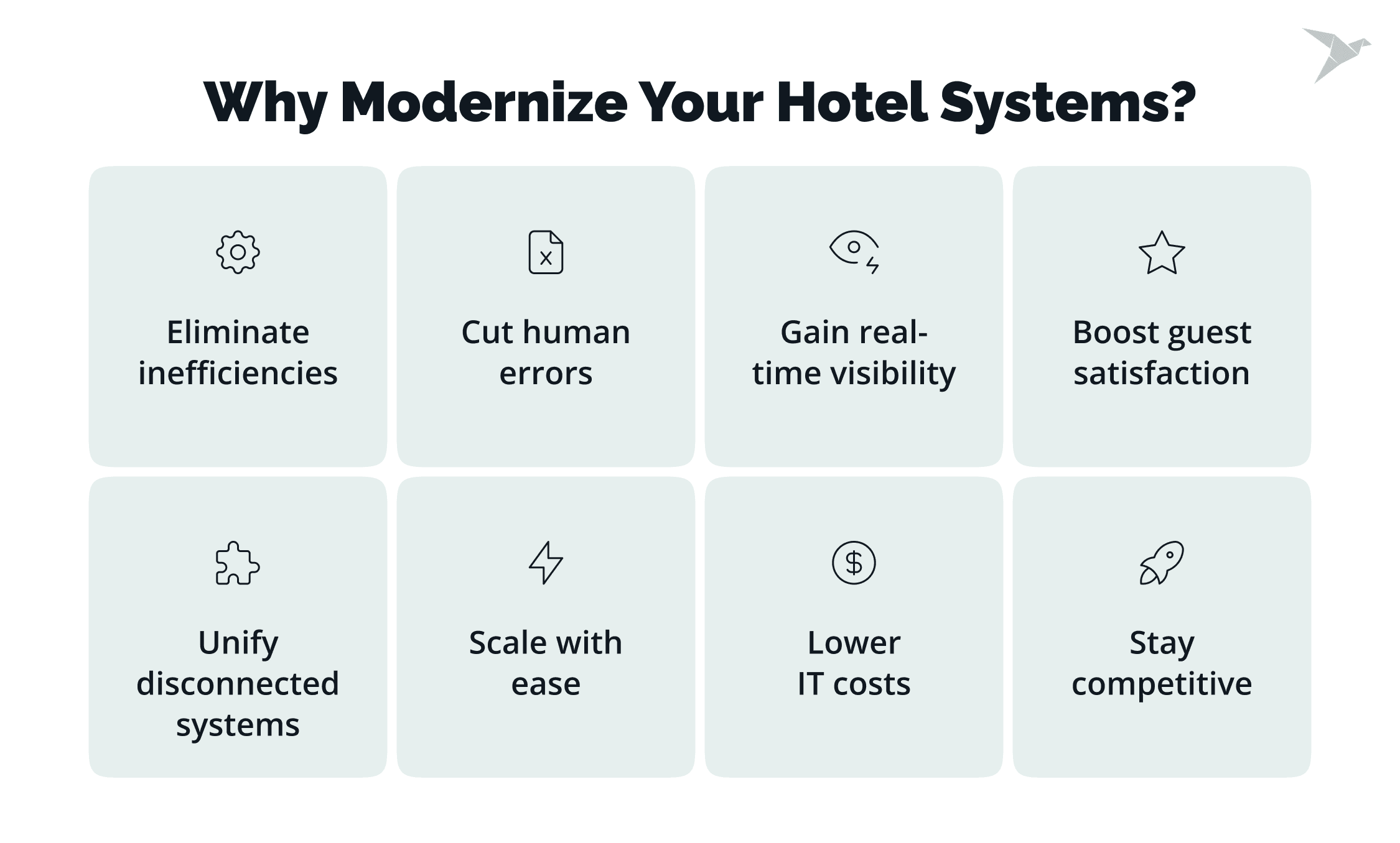 Upgrading legacy hotel systems is a way to solve real, costly problems that slow you down every day. Here’s why it matters: