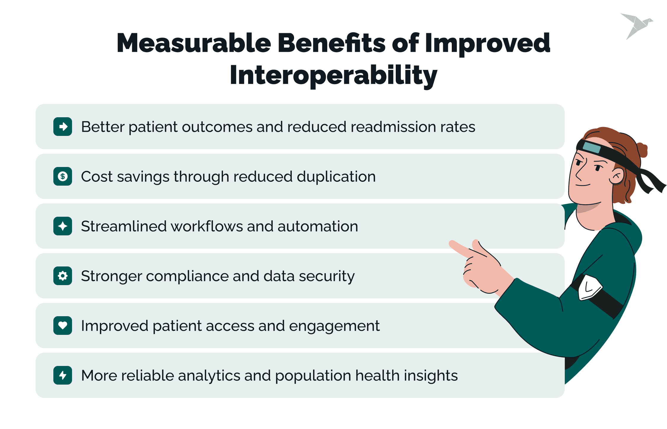 - Better interoperability leads to better outcomes, lower costs, stronger security, and richer analytics for health providers.