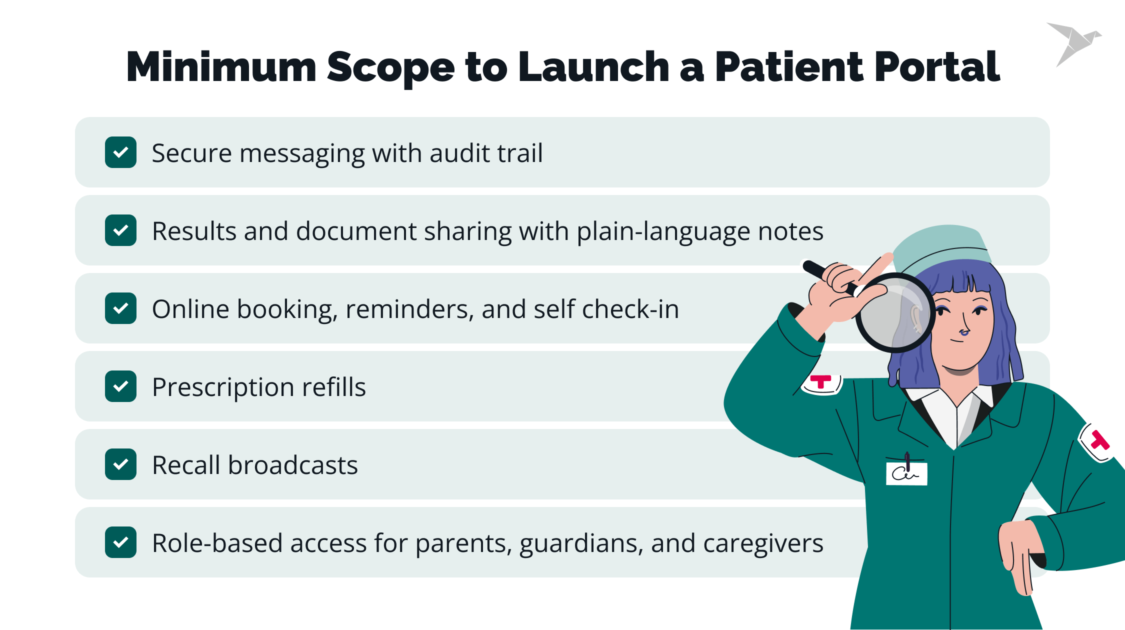 A modern portal should provide strong identity verification and MFA, real-time access to labs, imaging, and visit notes. It also must have self-service scheduling with confirmations and reminders, prescription refill requests, and encrypted messaging with the care team.