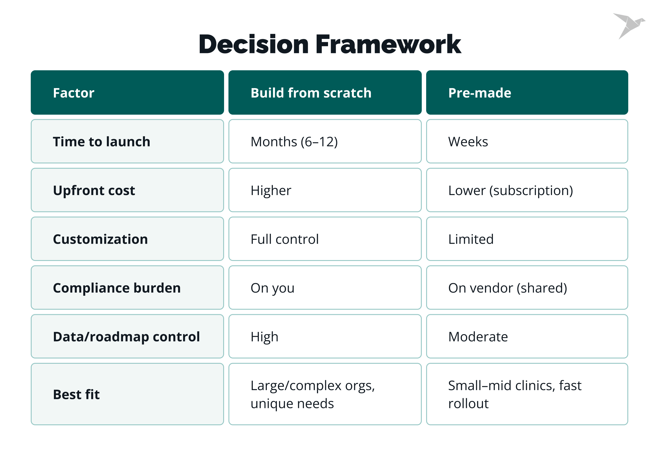 - Choose a pre-made portal, a custom build, or a hybrid based on your timeline, budget, and how much customization and compliance ownership you need.
