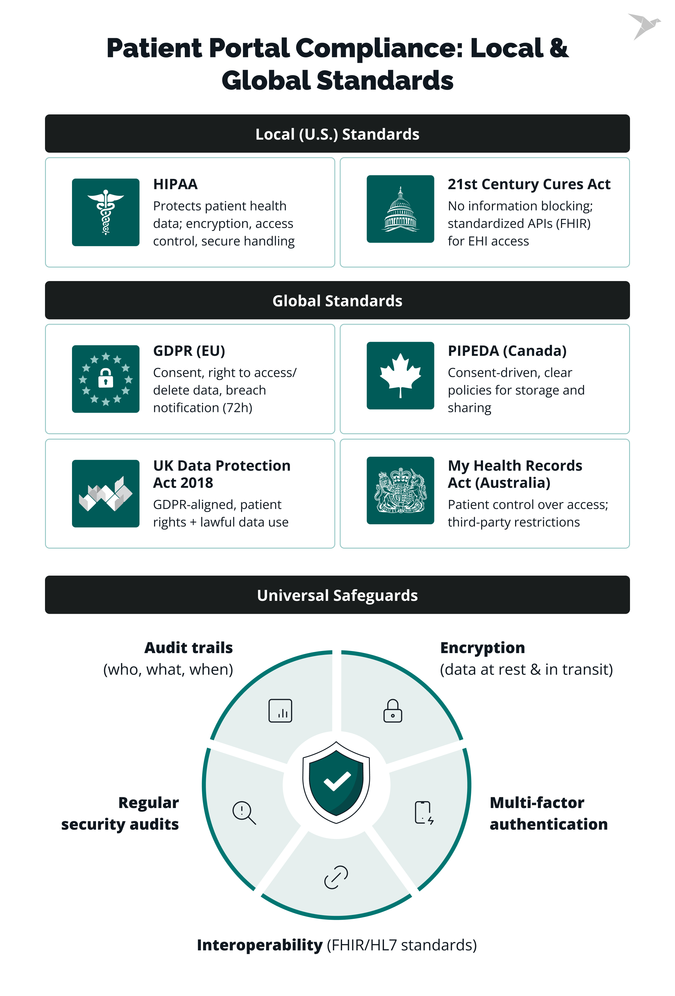 Both HIPAA and GDPR frameworks emphasize safe data exchange. Interoperability through HL7 FHIR or similar standards allows portals to integrate with EHRs, pharmacies, labs, and other clinical systems without creating data silos.