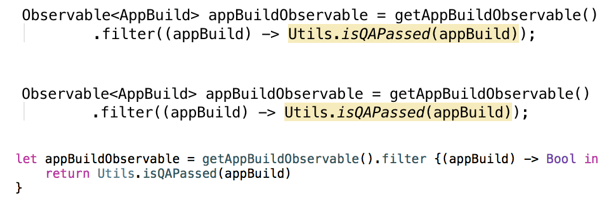 The appBuildObservable is a far more interesting one. We have to test literally each and every build as it can not go live without a QA engineer. Speaking the reactive language, we need to apply filtering to the observable in order to avoid emitting inappropriate results.