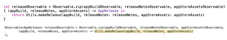 Evidently, we have different observables. How to play with them so as to get eligible results? I would suggest using zip operator for combining appBuildObservable, releaseNotesObservable and appStoreAssetsObservable. It joins the emissions of multiple observables via a specified function and produces single items for each combination.