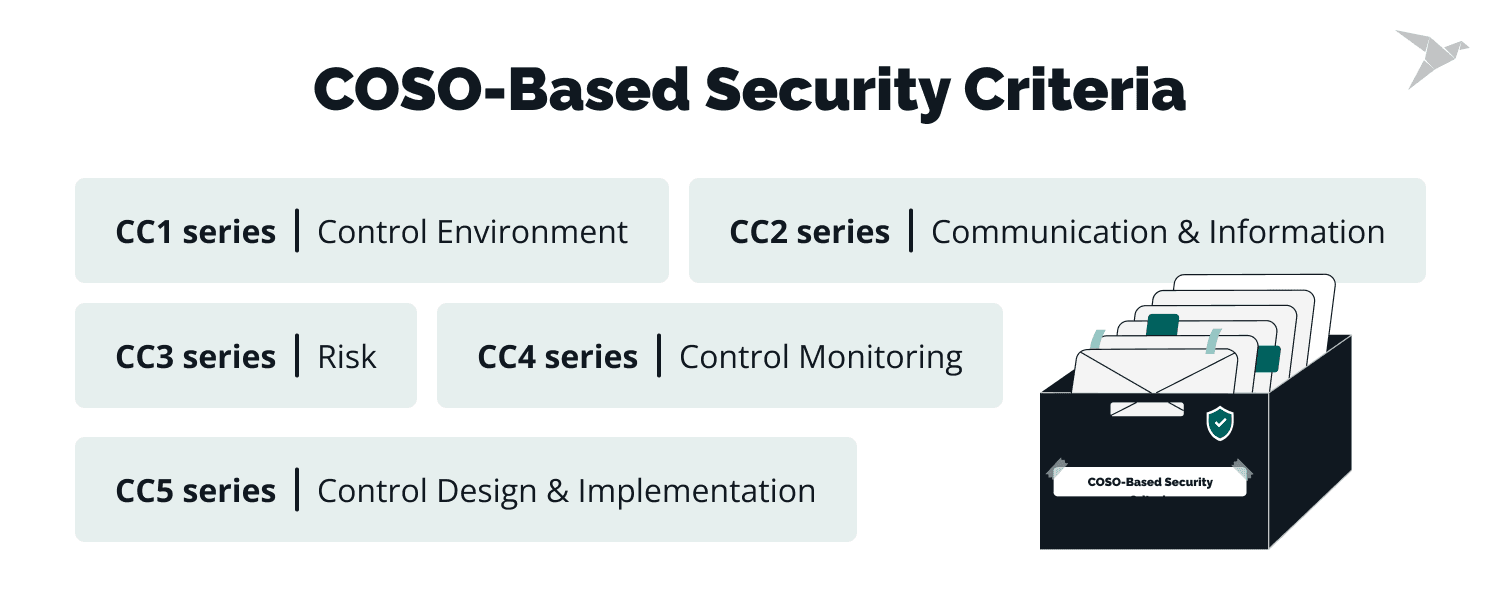 Security TSC has nine criteria (security controls), five of which are based on the COSO framework – a widely used framework for designing, implementing, and evaluating internal controls within an organization.