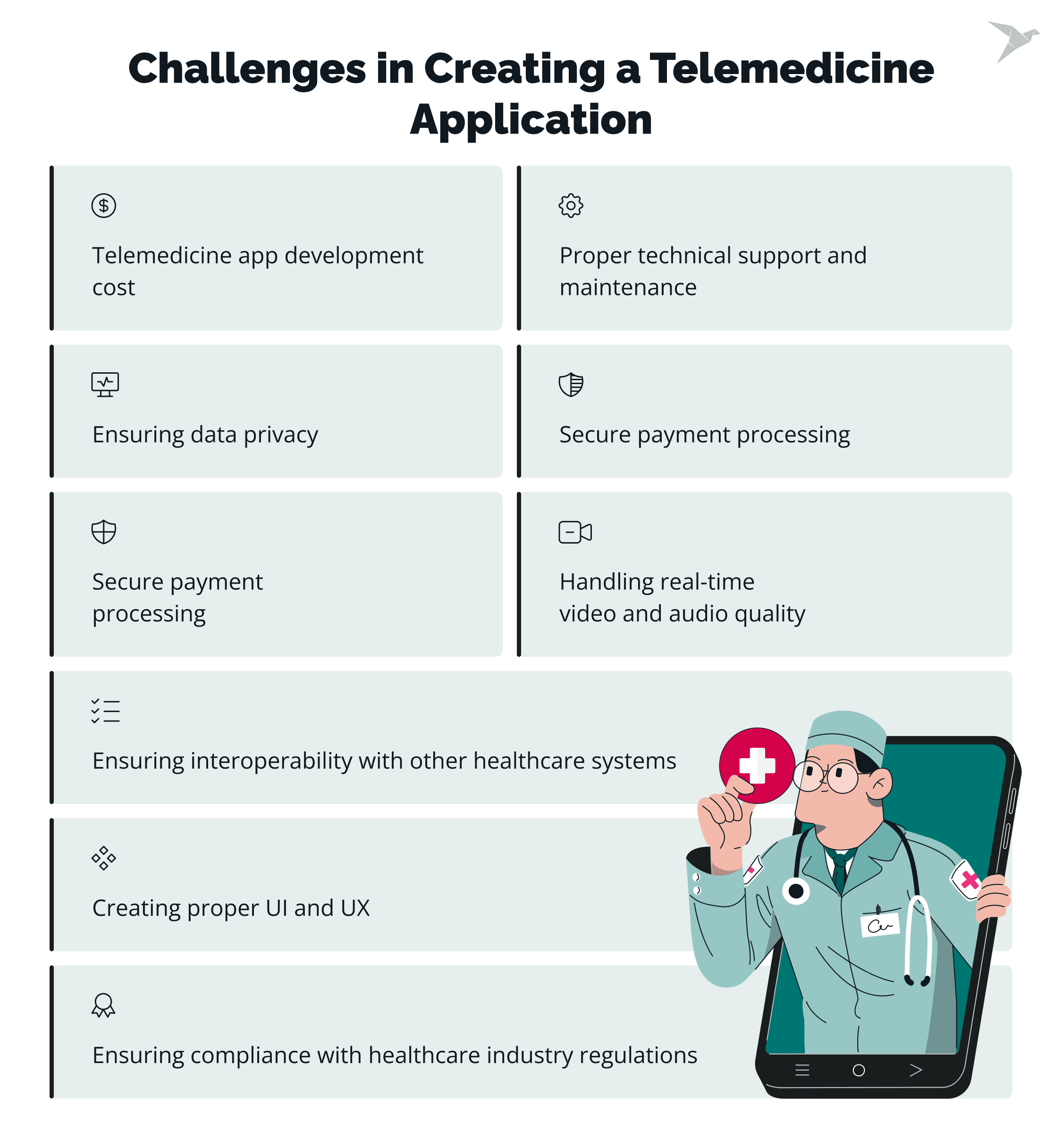 Telemedicine apps must comply with various regulations: global and local healthcare standards. The main issue is that they can vary by country and region, and constantly update and change. Navigating these legal requirements can be complex, especially when the app handles sensitive patient data.