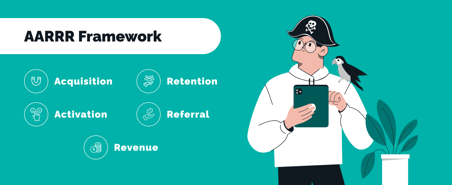 The framework follows the customer journey, and allows you to answer key strategic questions at every step. Questions like which channels customers are using to find your product for the first time, whether they are coming back for more and how often, which user actions are generating most revenue and so on.