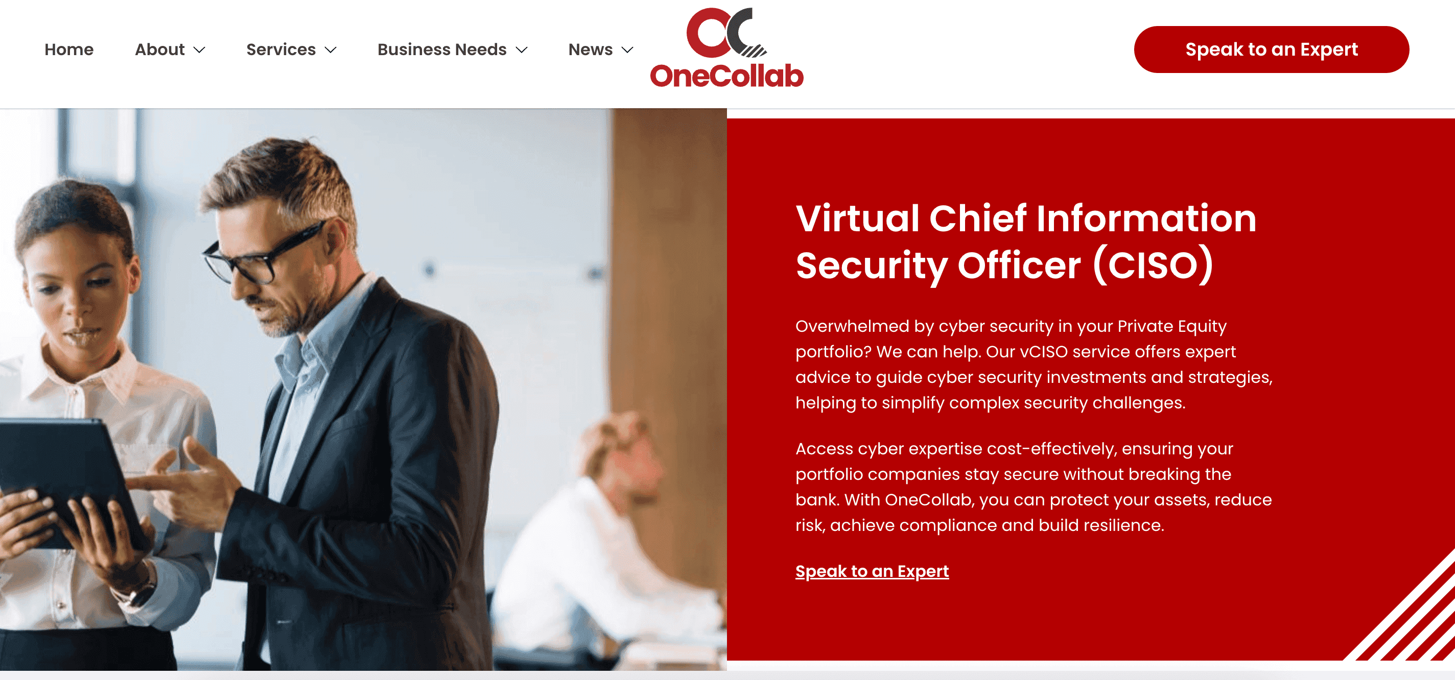 OneCollab is a cyber advisory boutique focused on private equity firms. The broad range of OneCollab's professionals offers vCISO expertise tailored for PE (Private Equity) portfolios. They provide security leadership and strategic guidance to secure multiple portfolio companies cost-effectively. Their virtual CISO consultants help clients optimize cybersecurity investments and ensure acquisitions meet regulatory and risk requirements.