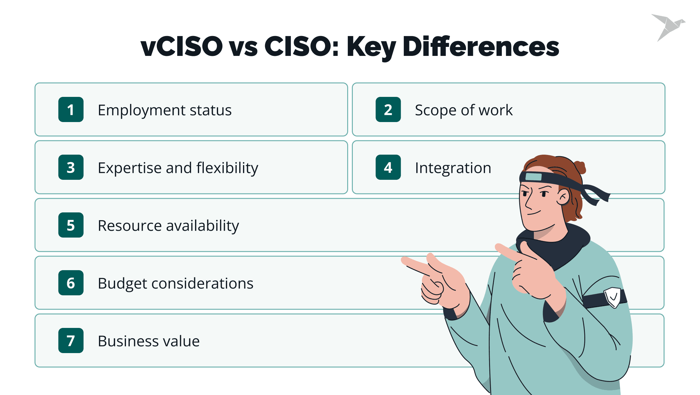 - Business impact: vCISOs bring flexibility, cost savings, and cross-industry insight. CISOs provide deep organizational alignment and continuous risk management.